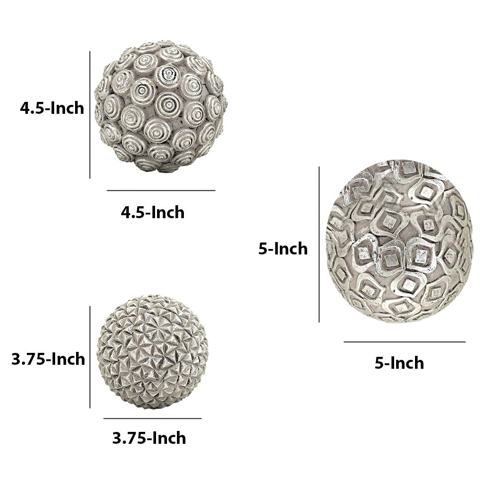 Handcrafted Decorative Orb Ball, Textured, Polyresin and Glass, Set of 3, Antique Silver